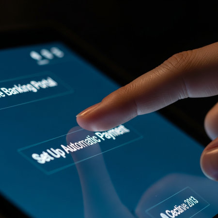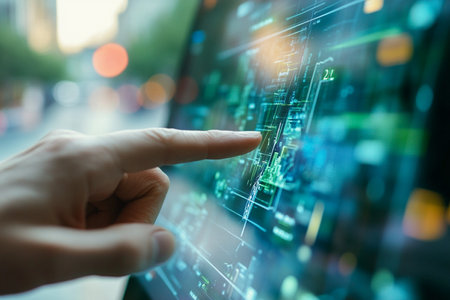 A hand interacts with a touch screen displaying a futuristic digital interface. The image features glowing blue and green elements against a dark background, suggesting technology and innovation. The composition includes close-up focus and soft lighting. Suitable for use in technology articles and commercial visuals.