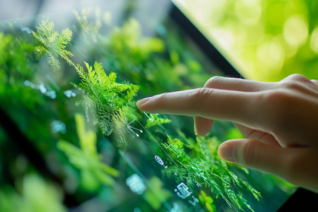 A close-up shot of hands holding a tablet displaying a photograph of lush foliage, set against a backdrop of real green plants. The image suggests a blend of technology and nature, possibly showcasing botanical research, digital documentation, or artistic inspiration. The focus is on the tablet's screen and the surrounding greenery, creating a sense of immersion in a natural environment.