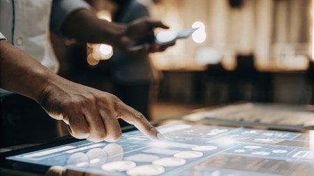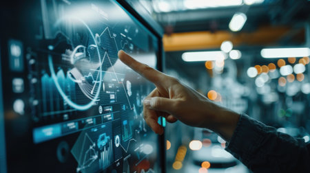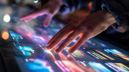A closeup view of a futuristic digital interface showcasing advanced touchscreen technology, highlighting user interaction and data visualization elements.