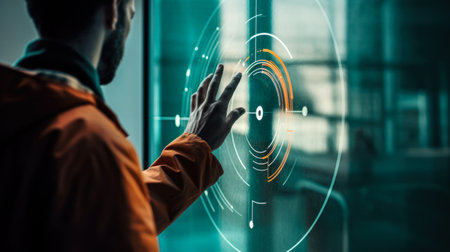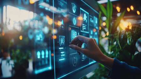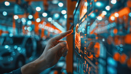 A close up of a hand interacting with digital control panels, showcasing advanced technology in a modern environment with a focus on user engagement and innovation