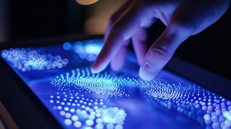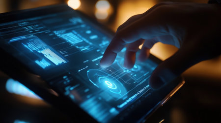 Close up of hand gently touching glowing touchscreen, showcasing interaction with technology. warm light from screen highlights details of finger, creating engaging and modern atmosphere