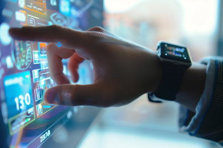 A person interacting with a modern, luminous touchscreen interface, featuring vibrant graphics and data. The individuals smart watch highlights a seamless connection for enhanced user experience.