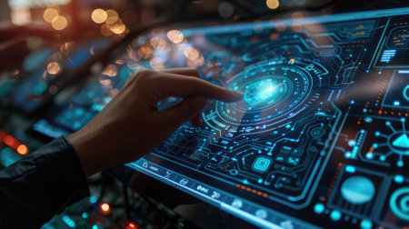 Finger pressing futuristic touchscreen with glowing interface and tech background. Concepts of advanced technology, biometric security, and digital interaction.