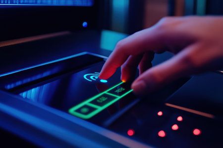 Medium shot focused on a person scanning their fingerprint on a biometric access control panel in a hightech office environment