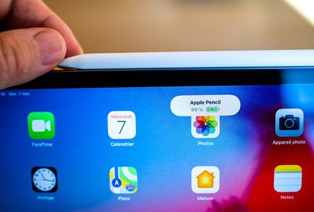 PARIS, FRANCE - NOV 7, 2018: Front view POV personal perspective experiencing new Apple iPad Pro tablet with Apple Pencil charging message on the top of the screen