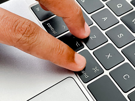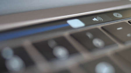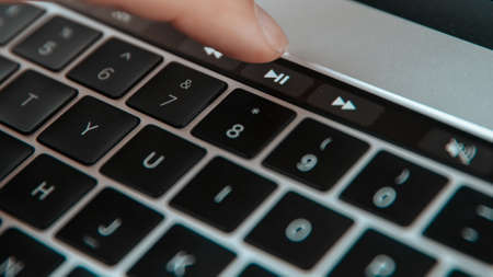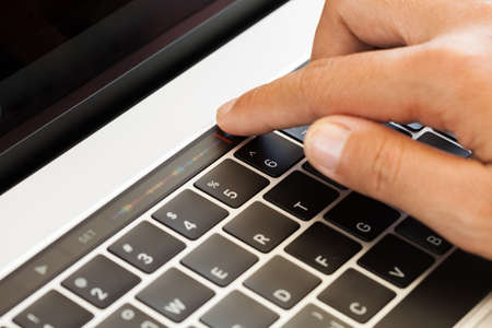 Close-up hand touching touch bar on laptop computer