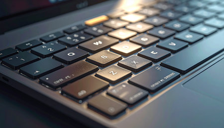Golden hour light streams across a modern laptop keyboard, highlighting the unique, unmarked blank keys.