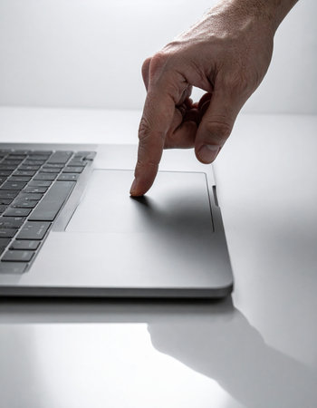 A person's finger makes precise contact with a sleek laptop trackpad, navigating the digital world with focus and control.