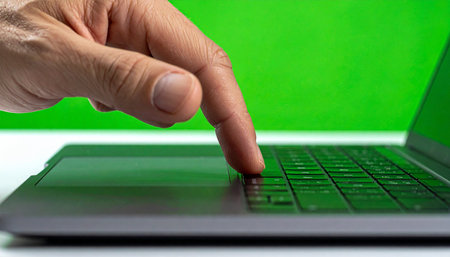 A close-up shot captures a person's finger making contact with a sleek laptop, set against a vibrant green screen.