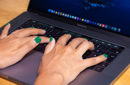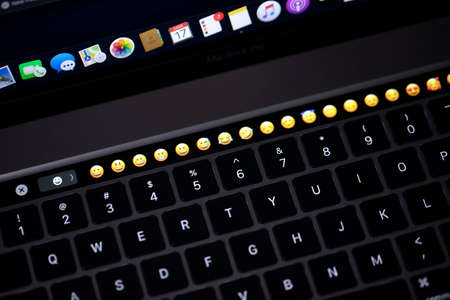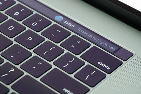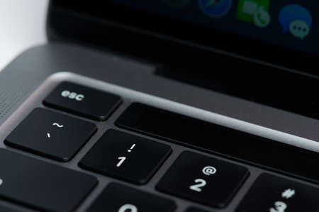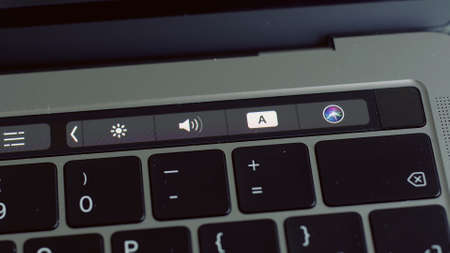 New york, USA - September 15, 2020: Close up of macbook pro keyboard with touchbar and screen