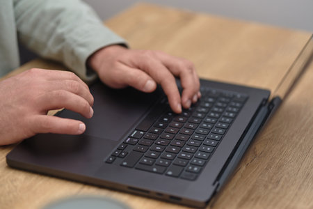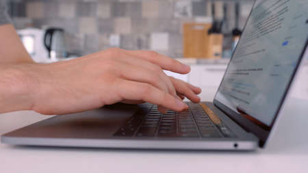 Close up of man hands typing on laptop keyboard. Action. Side view of male hands and his laptop on blurred background of a kitchen, business and communication concept.