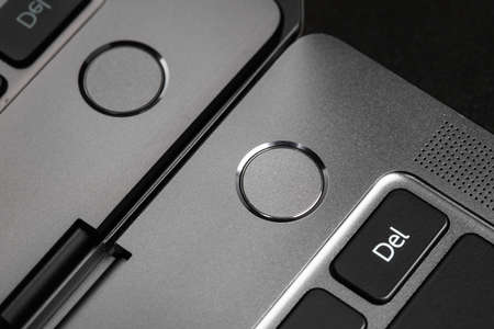 Close up photo of woman touching laptop fingerprint sensor with her finger to log in into system. Biometric fingerprint print scan provides security access with user identification. Computer privacy and security concept.