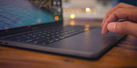 Closeup shot of caucasian male hand on touchpad of modern laptop