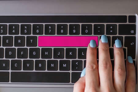 close-up female hand pressing enter button on a laptop keyboard