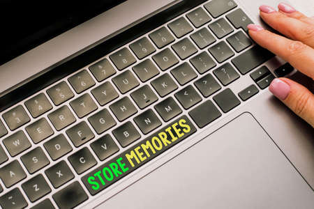 Sign displaying Store Memories. Word for a process of inputting and storing data previously acquired Hands Pointing Pressing Computer Keyboard Keys Typewriting New Ideas.