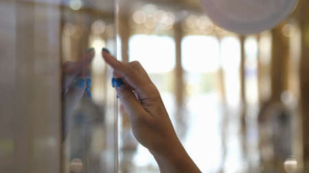 Woman's hand and the index point at the mirror in the dark room.