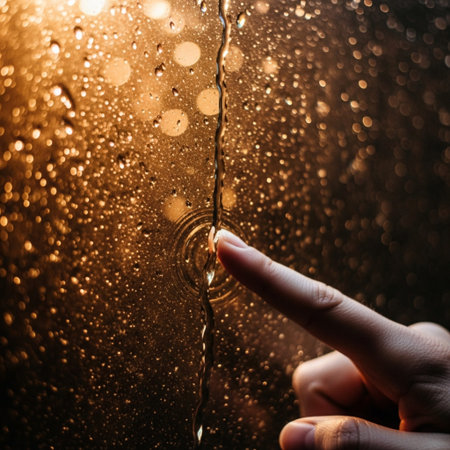 A close-up view of a hand gently touching a glass surface, capturing the play of soft light and reflections. This serene moment evokes feelings of connection and exploration.