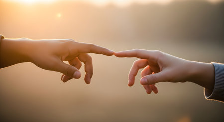 Two hands reach out towards each other with index fingers gently touching against a soft, warm sunset background. This image symbolizes connection, contact, humanity, and the start of a relationship.