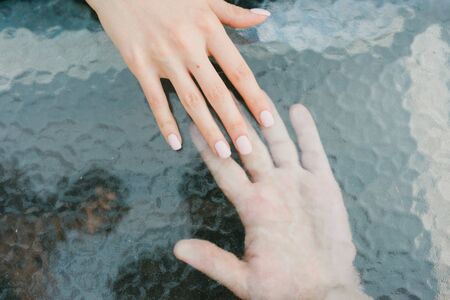 Hands of a man and a woman against the background of a blurred window. The gentle touch of a man and a woman. Love connection help concepts. Be hand in hand. Touching each other.