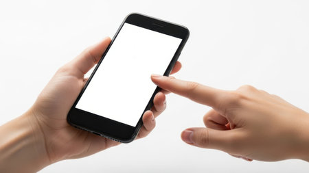 closeup hand woman holding black smartphone blank screen and tiuching isolate on white background