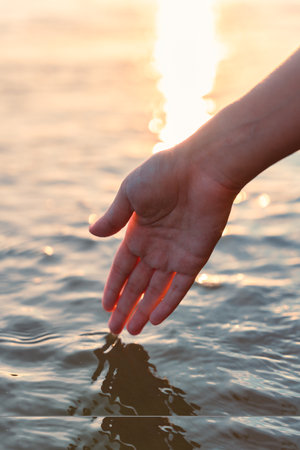 Hands with pure water. Closeup of a woman's hand touching the lake water. A person's hand reaching out to touch a rippling water surface, exploring the tactile dimension of sensory perception. A concepts of cleansing, nature, environment and sustainability