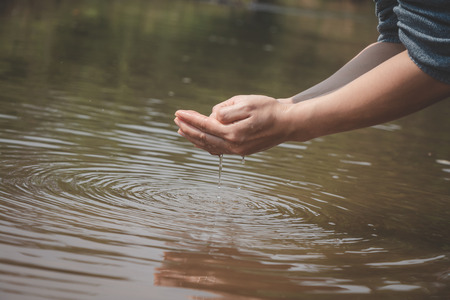 Human hand is touching water on the river,water crisis