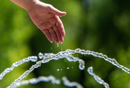 Hand of a man in the spray of water of the fountain in the summer.