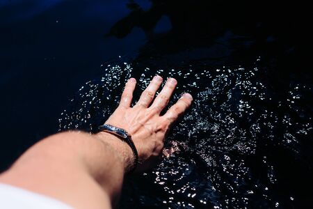 The girl's wet Hand is stroking the wave. Touching the river with the palm of your hand while walking along the embankment