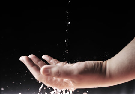 Photograph of an open human hand under water drops