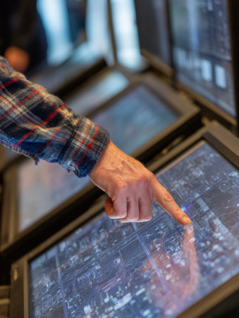 Man using interactive touchscreen display of electronic multimedia kiosk at modern museum or exhibition - scrolling and touching - close up view. Education, entertainment, learning, technology concept