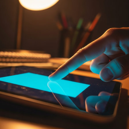 A delicate finger interacts softly with a tablet?s illuminated display, set against a backdrop of soft, glowing lights that evoke warmth and concentration in a quiet