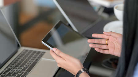 Close-up image of a female hands is tapping on tablet touchscreen computer on wooden working desk.