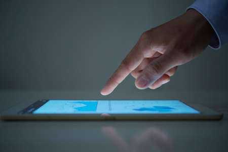 Crop hand of anonymous businessman scrolling charts on modern tablet in dark room