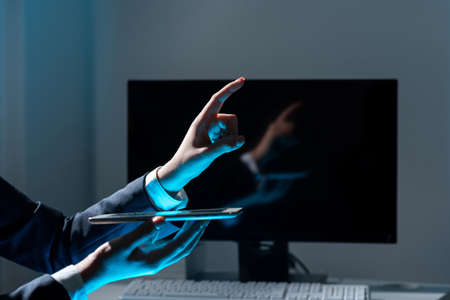 Side close up view, woman hand using touchscreen display of floor standing tablet kiosk at modern technology exhibition or museum with futuristic sci-fi interior and purple light