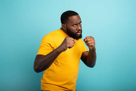 Portrait of man aggressive fighter holding clenched fists up ready to boxing, martial art trainer. Indoor studio shot isolated on white background