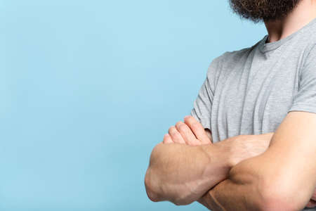 cropped man torso on blue background expressing power force leadership supremacy confidence. man with folded arms. business trainer or life coach concept.