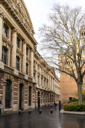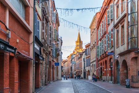 Rue du Taur in winter and the Basilica of Saint Sernin in the distance, in Toulouse in Haute-Garonne, Occitanie, France