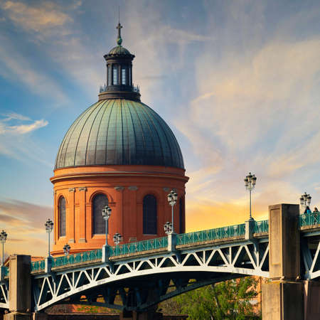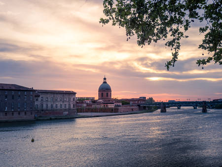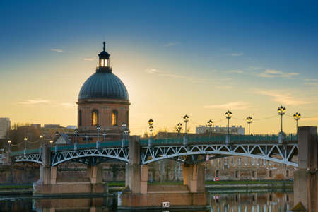 The dome of the Hopital de la Grave at dusk over the Garonne River in Toulouse