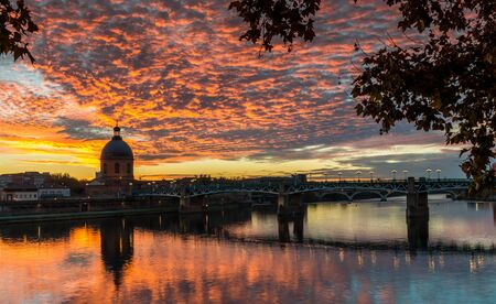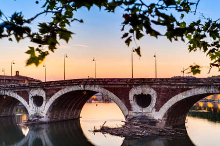 Famous view of Saint-Pierre bridge at sunset, Toulouse.