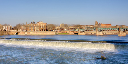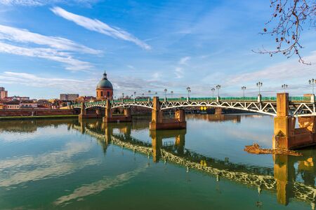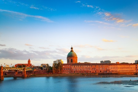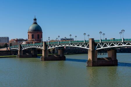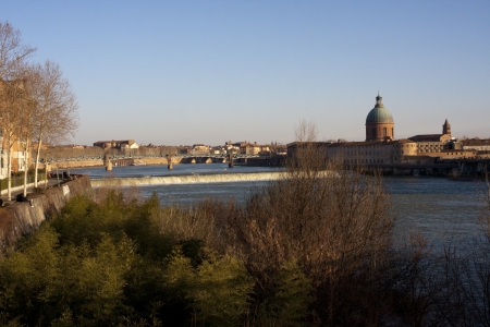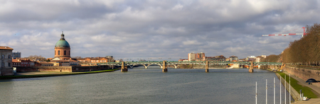 View over Garonne River in Toulouse in France towars bridge Saint-Etienne and dome of the Grave hospital.