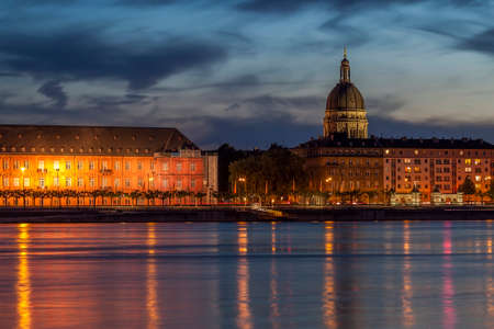 Beautiful sunset night over Rhine / Rhein river in Mainz near Frankfurt am Main, Germany.