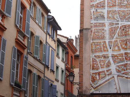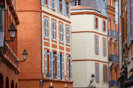 Warm sunlight on narrow street in old center of Toulouse, France.