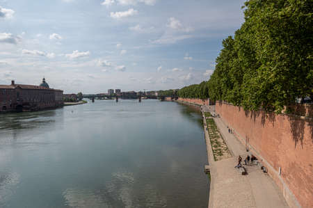 Toulouse, France : 2022 May 2 : Panorama of the promenade over the Garonne River on a Sunny day in Toulouse, France in the summer of 2022.