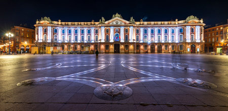 Illuminations of the Capitole by night and the Occitan cross, in Toulouse in Haute Garonne, Occitanie, France