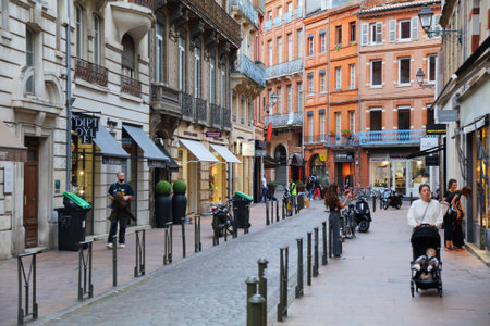 TOULOUSE, FRANCE - SEPTEMBER 28, 2021: People visit shopping street in downtown Toulouse city, Capitole district. Toulouse is the 4th largest commune in France.