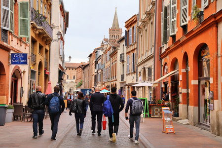 TOULOUSE, FRANCE - SEPTEMBER 28, 2021: People visit downtown Toulouse city, Capitole district. Toulouse is the 4th largest commune in France.