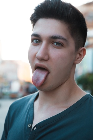A playful young boy sticks out his tongue in an exaggerated way, adding humor to the image.