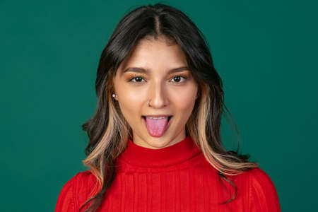 Tongue Young beautiful freckles woman face portrait with healthy skin. Studio shot.