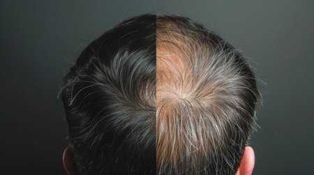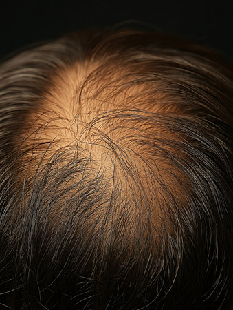 Man's head from above experiencing male pattern baldness, with thinning hair and visible scalp due to genetic and aging factors, illustrating the progression of alopecia