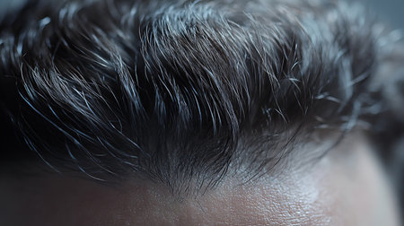 Close up of a man's scalp with receding hairline, showing the hairline, skin, and hair follicles.